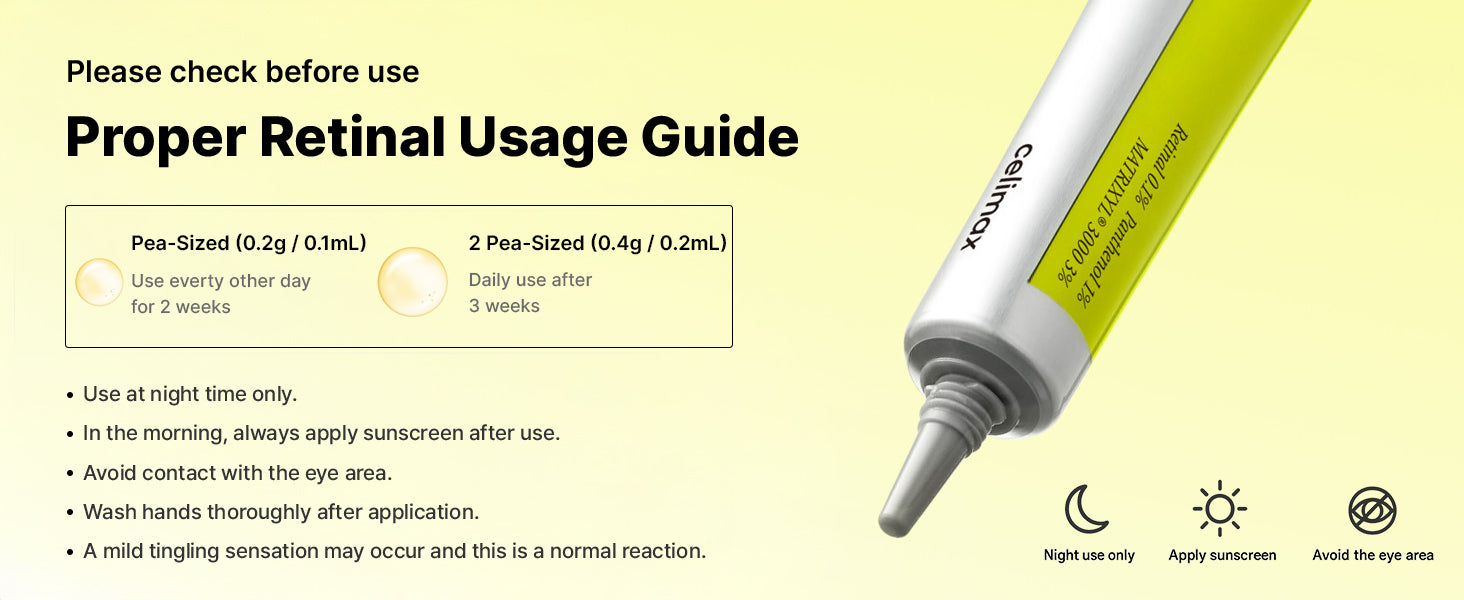If you are new to vitamin A / retinal / peptides, start every other night for the first 1-2 weeks to allow your skin to acclimate.